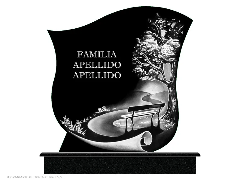 Frente para panteón funerario de cementerio de líneas curvas fabricado en granito Negro pulido con paisaje, pergamino e inscripción grabados en blanco con tecnología láser.