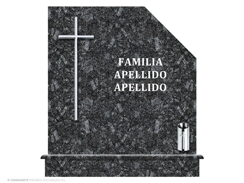 Frente para panteón funerario de cementerio fabricado en granito pulido de líneas rectas, que ofrece múltiples posibilidades de personalización, con cruz e inscripción.