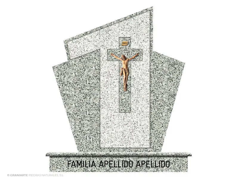 Frente para panteón funerario de cementerio fabricado en granito pulido de líneas rectas con cruz en relieve, para aplique de Cristo crucificado, en fondo cajeado y abujardado.