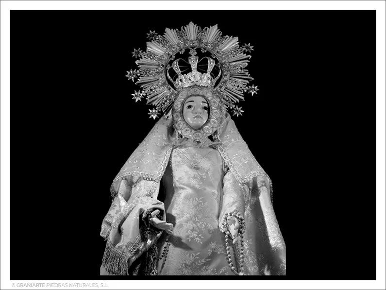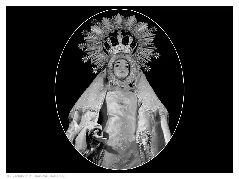 Imagen de la Virgen de Gracia grabada con tecnología láser en color blanco.