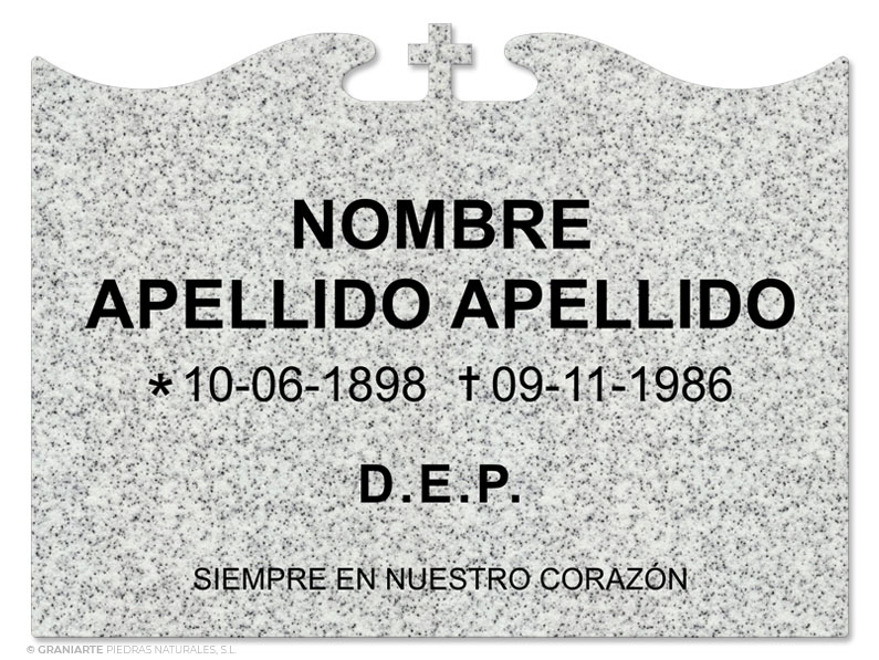 Placa funeraria de material acrílico que imita al granito terminada en adorno curvo con cruz en la parte superior para un nombre con inscripción grabada en bajorrelieve.