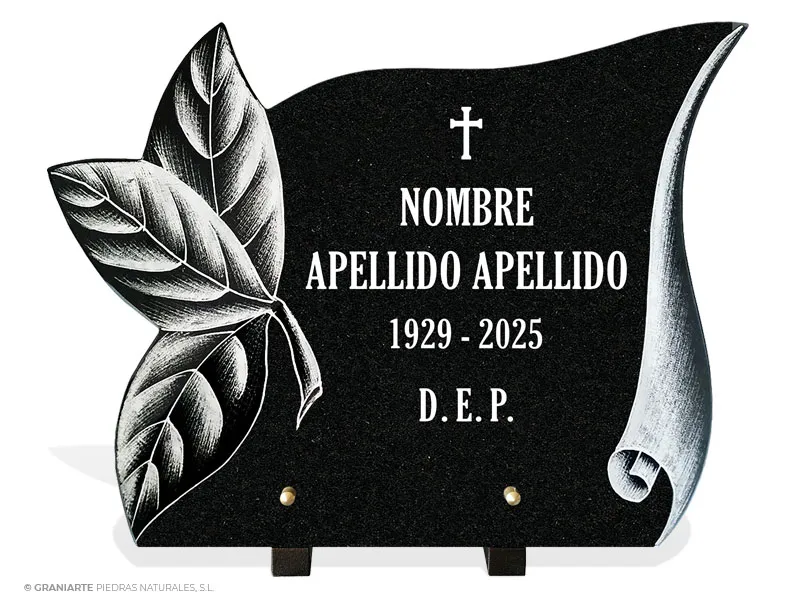 Placa funeraria para panteón de cementerio fabricada en granito negro con forma e imagen de pergamino con ornamento vegetal de hojas e inscripción grabada mediante tecnología láser. Dispone de soporte.
