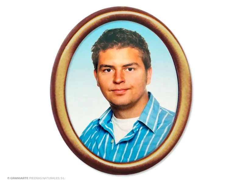 Aro de bronce para enmarcado de fotocerámica en óvalo a color. Indicado para instalación en superficie en lápidas de nicho o columbario y frentes de panteones.