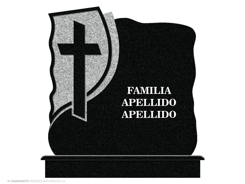 Frente para panteón funerario de cementerio en granito Negro pulido con cruz en relieve sobre fondo cajeado y abujardado en su parte superior izquierda e inscripción.