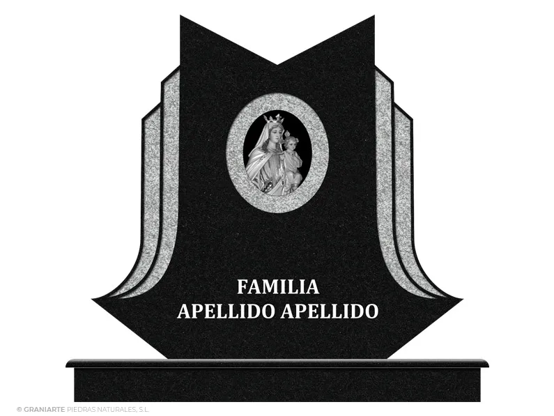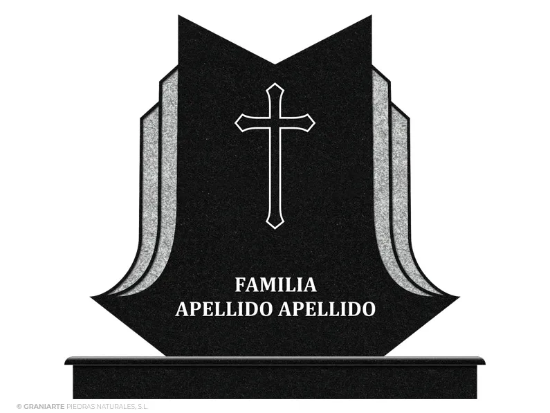 Frente para panteón funerario doble o triple de cementerio fabricado en granito Negro pulido con dos bandas laterales curvas ascendentes, perfiladas y abujardadas en relieve a distintas profundidades. Incluye cruz central e inscripción.