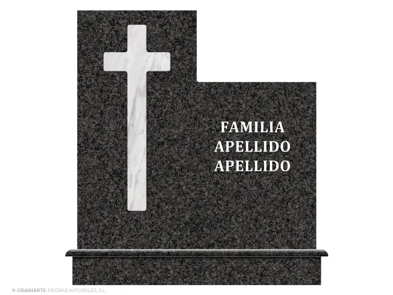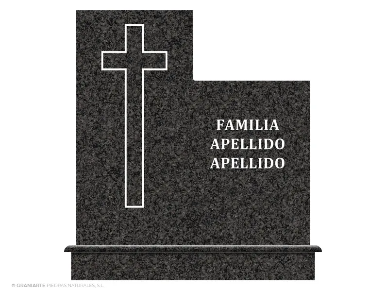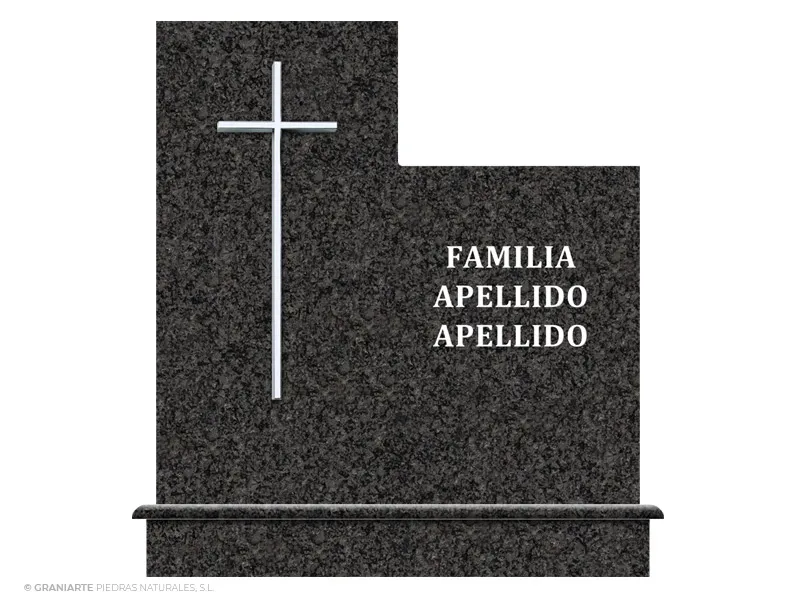 Frente para panteón funerario de cementerio fabricado en granito Negro Sudáfrica pulido de líneas rectas con cruz cajeada superpuesta en su parte izquierda e inscripción.