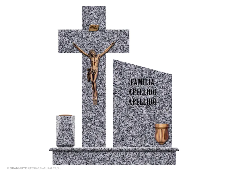 Frente para panteón funerario de cementerio tipo calvario fabricado en granito pulido Gris Quintana con jarrón de granito a la izquierda, cruz central y pieza trapezoidal a la derecha con inscripción.