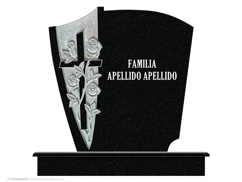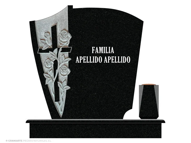 Frente para panteón funerario de cementerio fabricado en granito Negro pulido con cruz entre motivo floral en bajo relieve a la izquierda e inscripción a la derecha.
