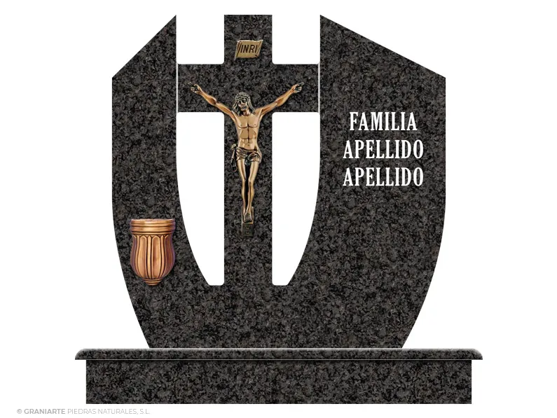 Frente para panteón funerario de cementerio fabricado en granito Negro Sudáfrica pulido de líneas curvas asimétricas ascendentes con cruz central e inscripción.