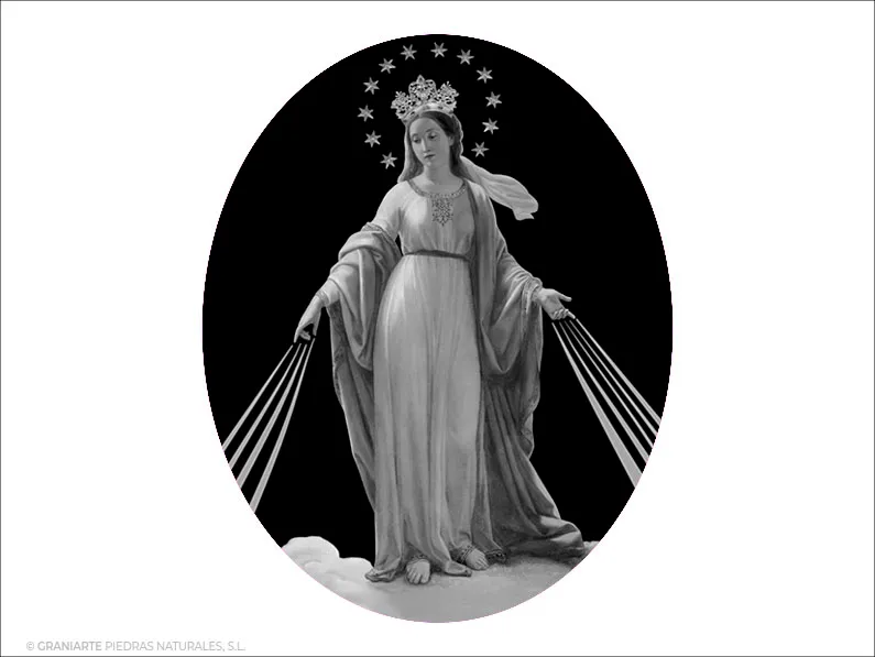 Imagen funeraria de la Virgen Milagrosa. Grabado con tecnología láser, en color blanco, sobre materiales negros.