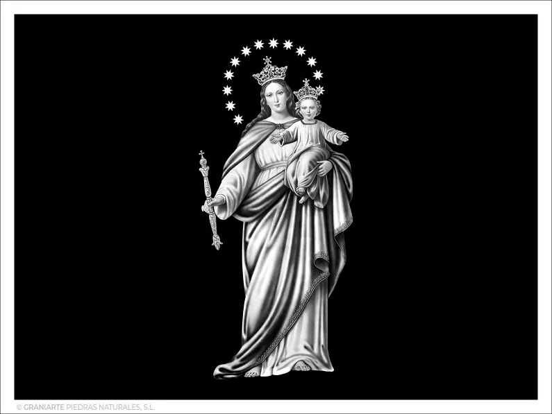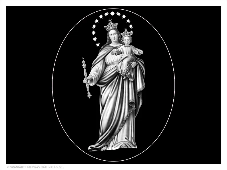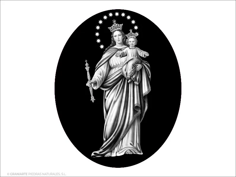 Imagen funeraria de la Virgen María Auxiliadora. Grabado con tecnología láser, en color blanco, sobre materiales negros.