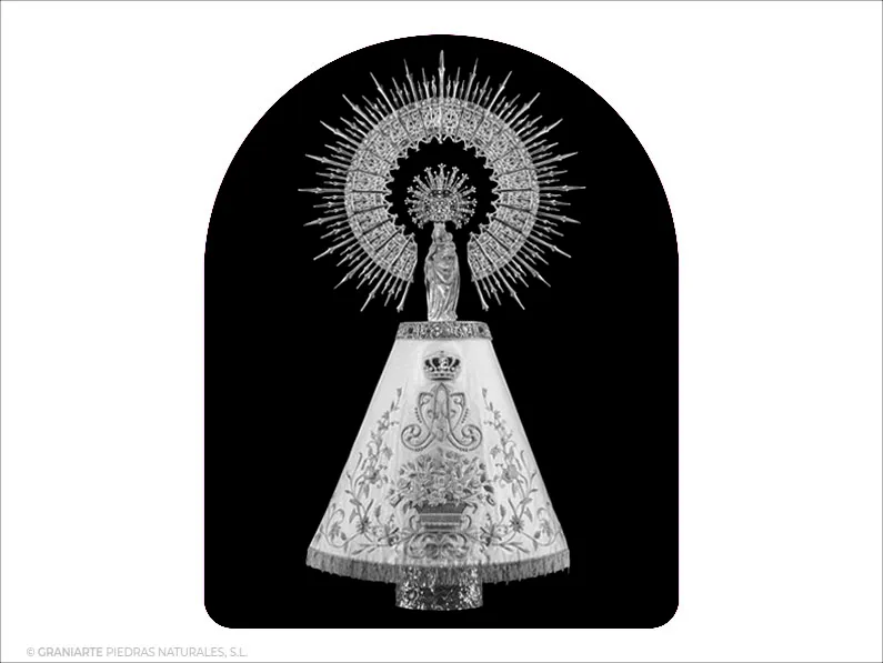 Imagen funeraria de la Virgen del Pilar. Grabado con tecnología láser, en color blanco, sobre materiales negros.