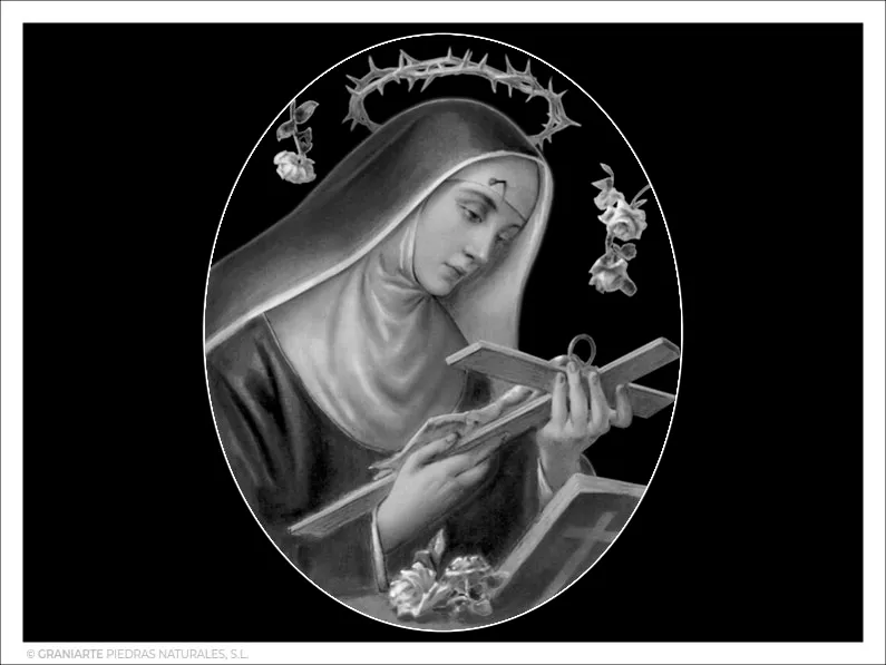 Imagen funeraria de Santa Rita de Casia. Grabado con tecnología láser, en color blanco, sobre materiales negros.