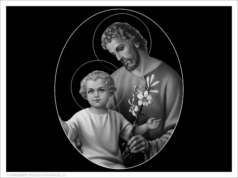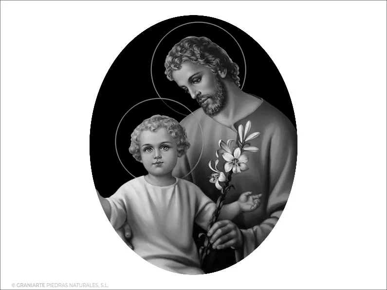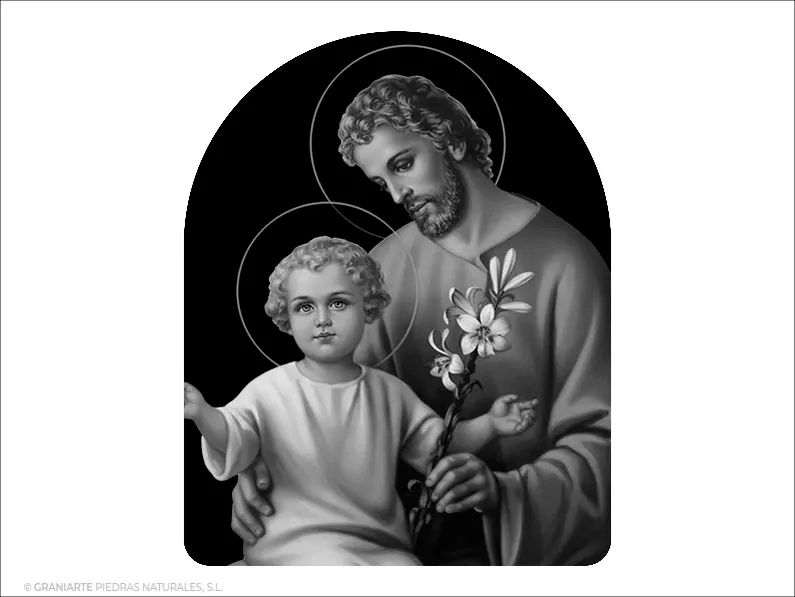 Imagen de San José y el Niño grabado con tecnología láser, en color blanco, sobre materiales negros.