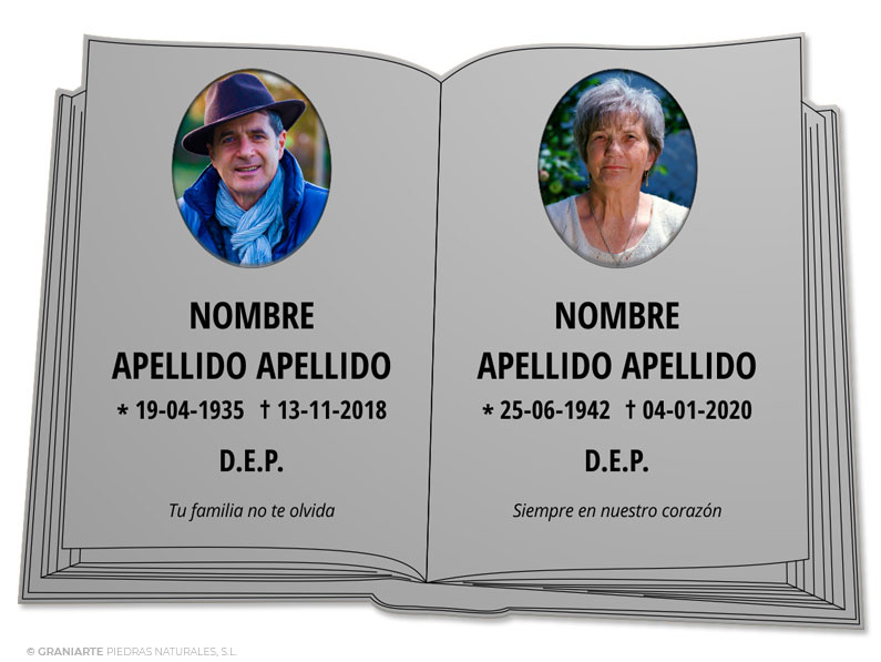 Placa funeraria para cementerio de metacrilato color gris en forma de libro moderno grande para dos nombres con dos imágenes personalizadas en óvalos fotocerámicos a color, colocados en hueco pasante una en la parte superior de cada página, grabada mediante tecnología láser.