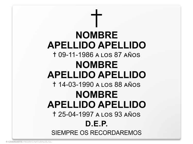 Placa funeraria para cementerio fabricada en metacrilato blanco simple y elegante para tres nombres con cruz.